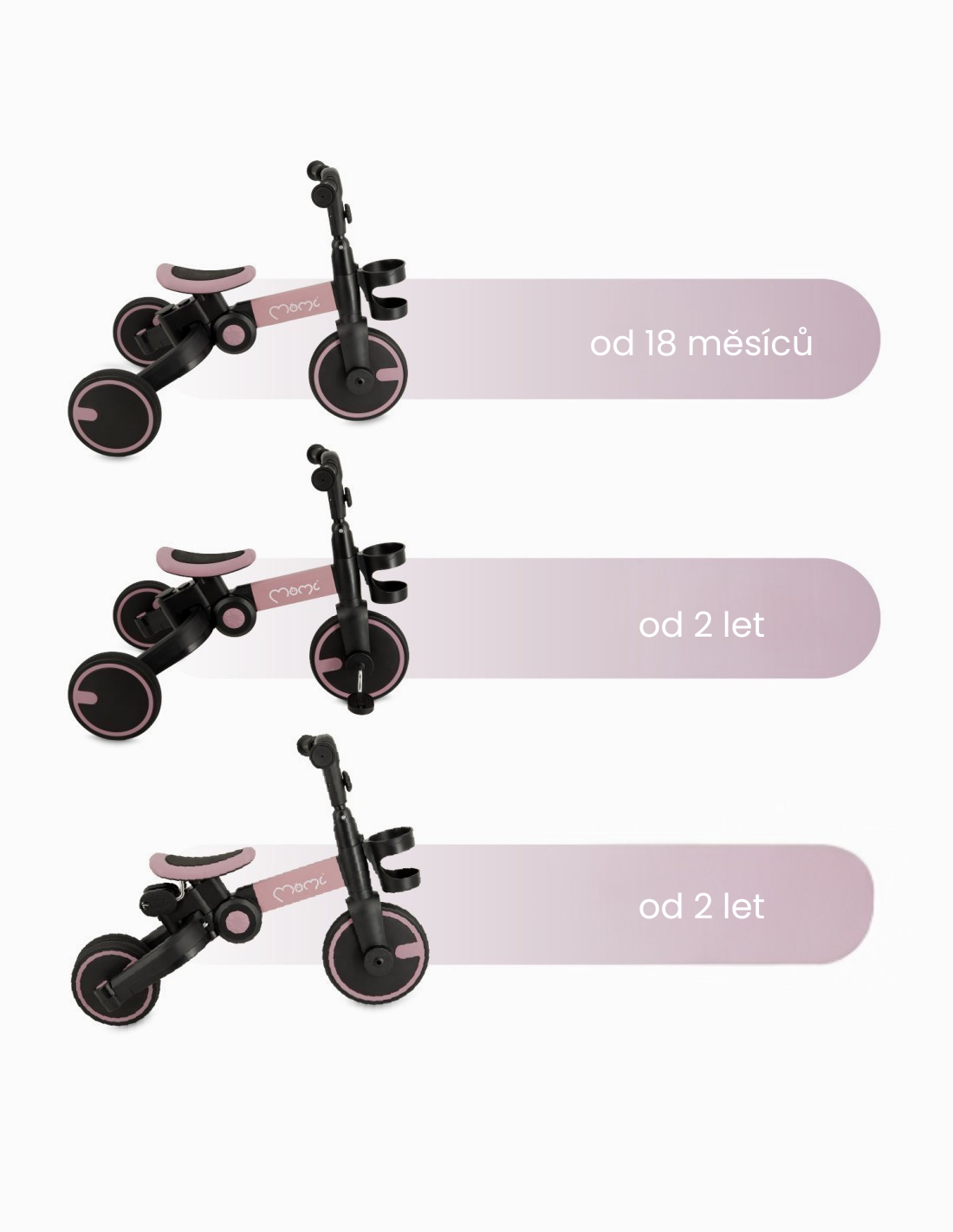 Odrážedlo 3v1MoMi FILO je odrážedlo, které zároveň plní funkci: tříkolky (od 18 měsíců), tříkolového kola s pedály (od 2 let) a klasického balančního kola (od 2 let). |