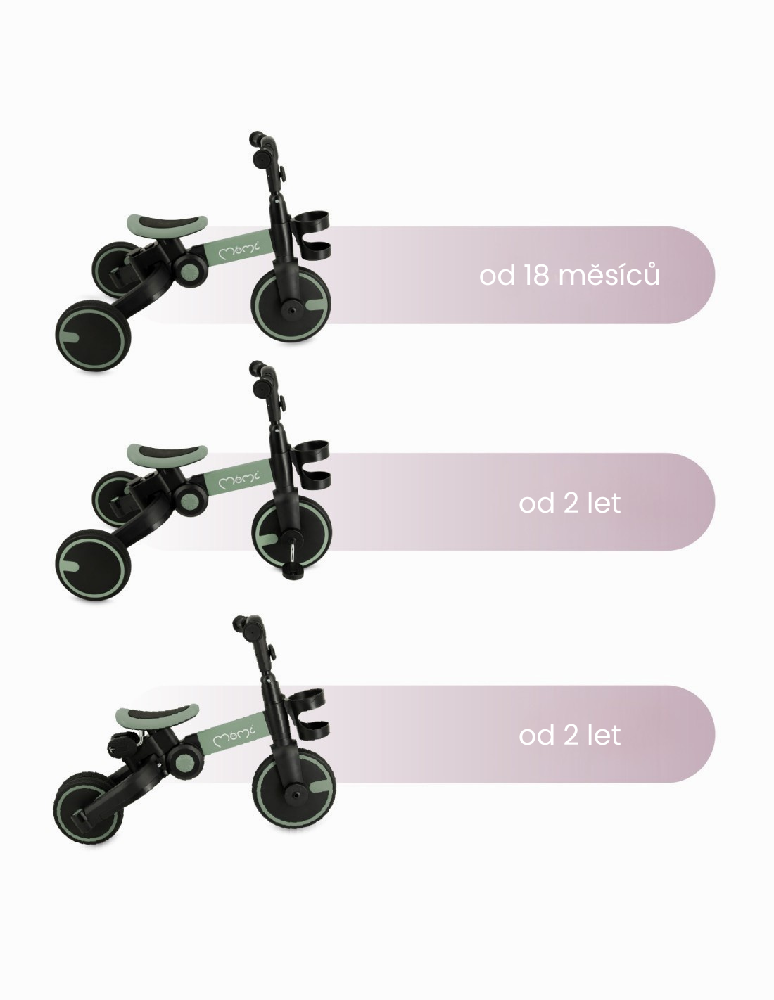 Odrážedlo 3v1MoMi FILO je odrážedlo, které zároveň plní funkci: tříkolky (od 18 měsíců), tříkolového kola s pedály (od 2 let) a klasického balančního kola (od 2 let). |