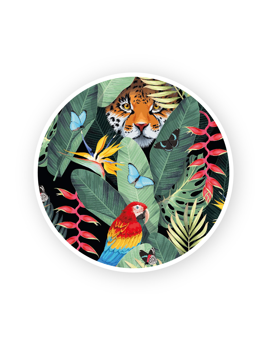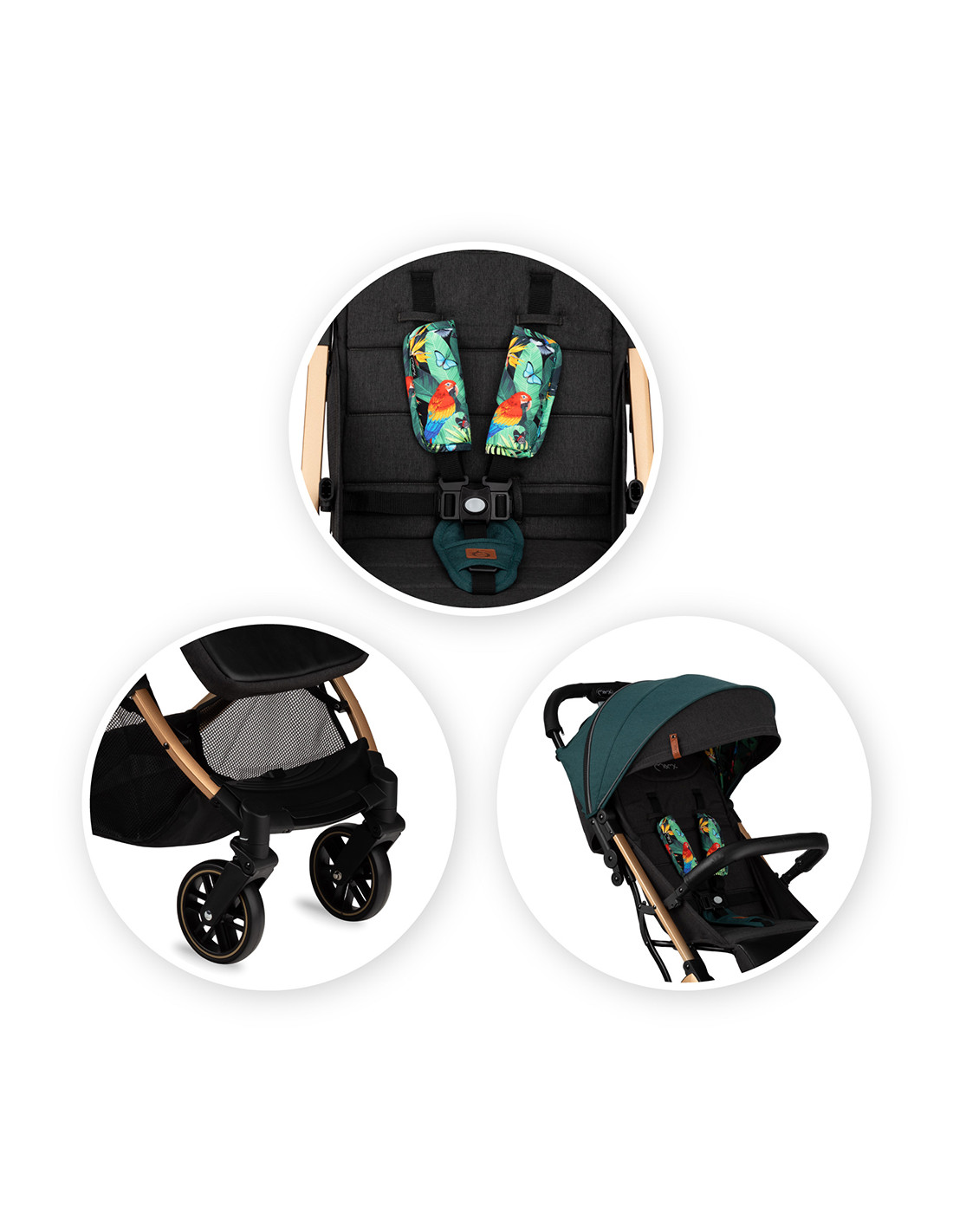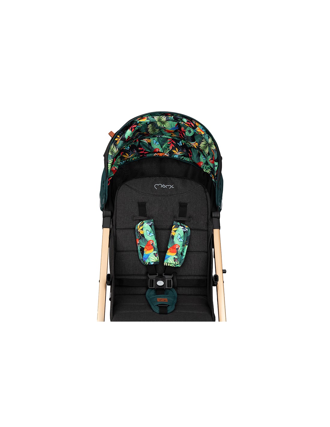 Nejodvážnější a nejbarevnější návrh z kolekce MoMi ESTELLE GOLD! Nádherné lemy s motivem exotické džungle dokonale doplňuje khaki potah. Vaše dítě si zamiluje papouška sedícího na rameni.