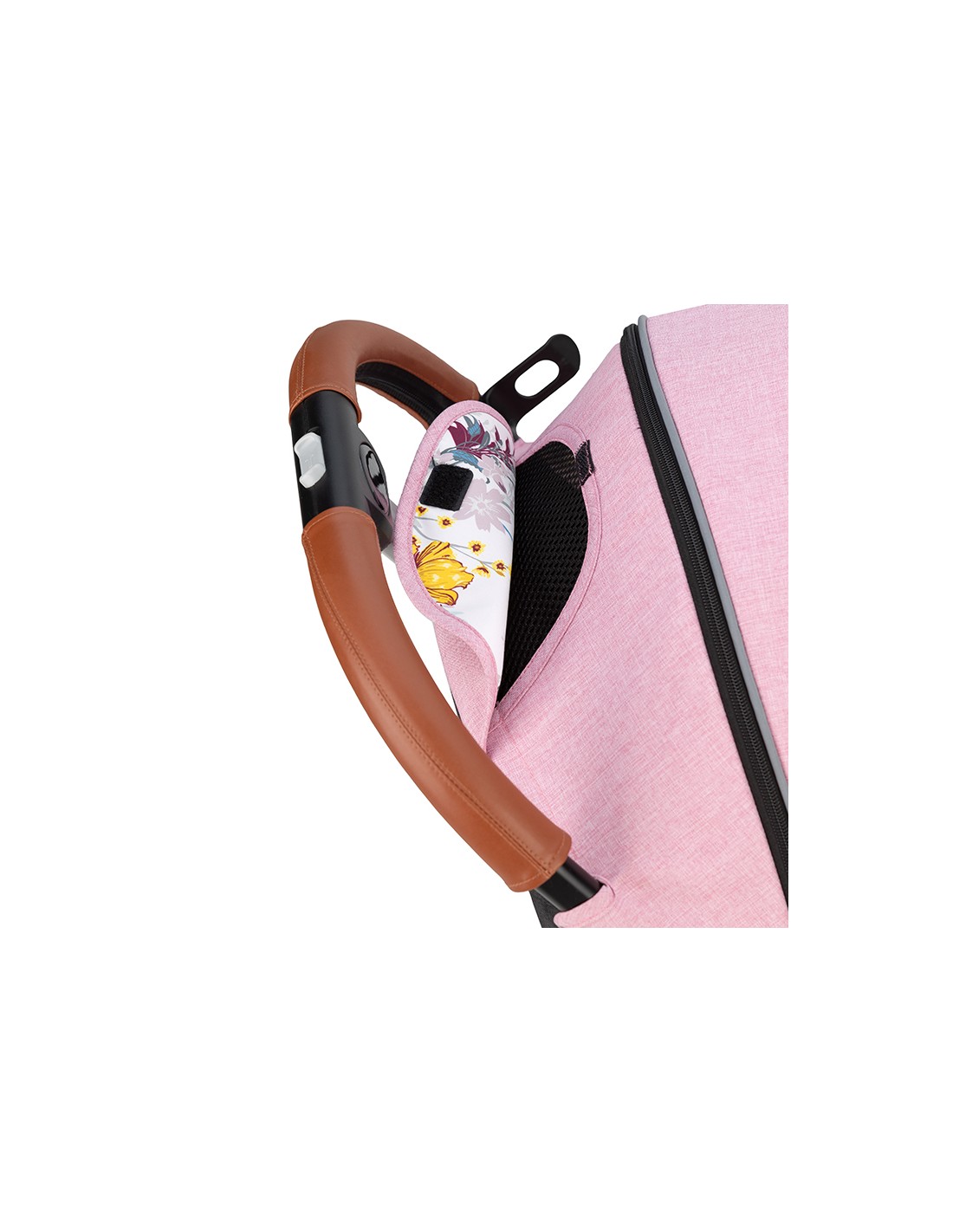 Rukojeť pro tlačení kočárku a madlo v přední části jsou potaženy ekologickou kůží. Pod ní se nachází další pěnová vrstva, která poskytuje dvojnásobnou ochranu. |