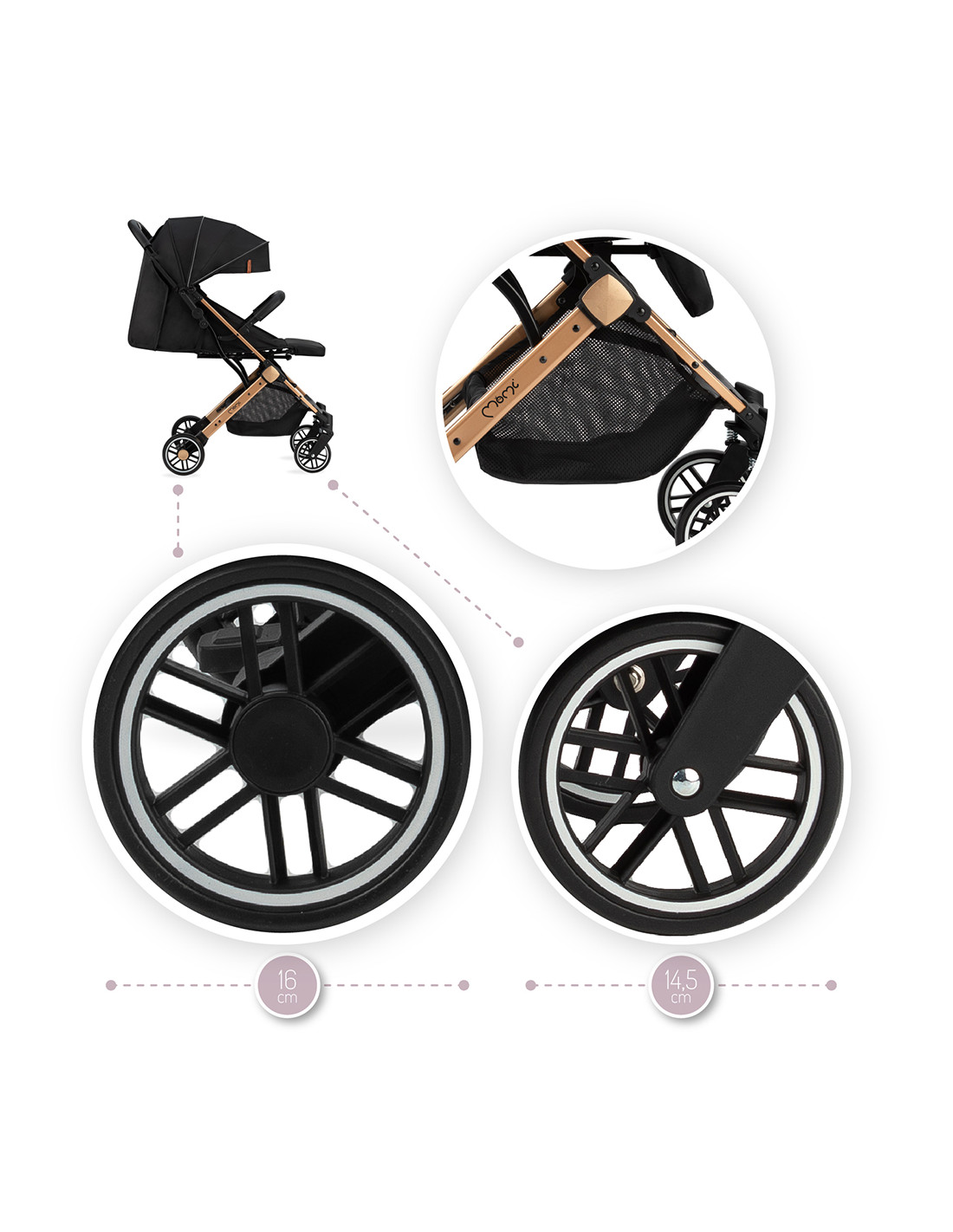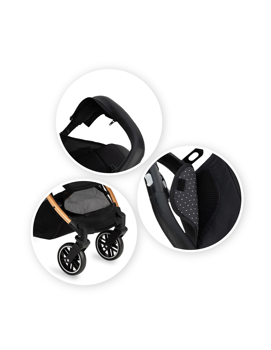 MoMi ESTELLE GOLD v černé barvě je absolutní bestseller od MoMi, který si ukradl srdce maminek a dětí po celém světě! Je klasický, elegantní a pohodlný, navíc má absolutní hit, který mamince usnadní život - madlo pro vedení složeného kočárku!