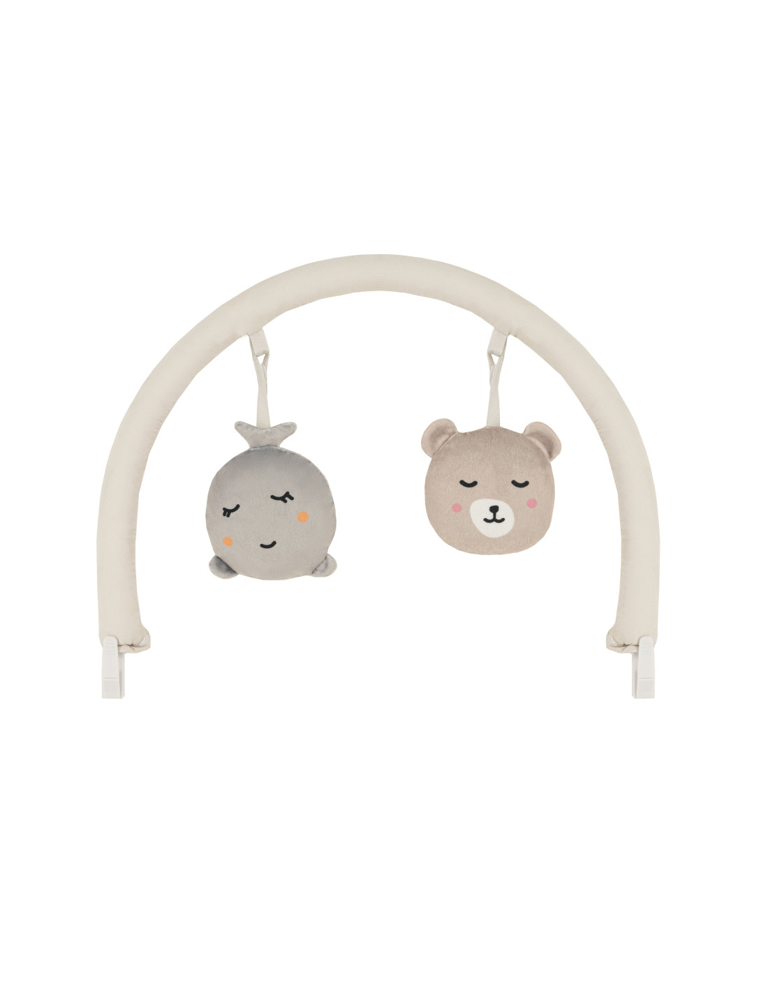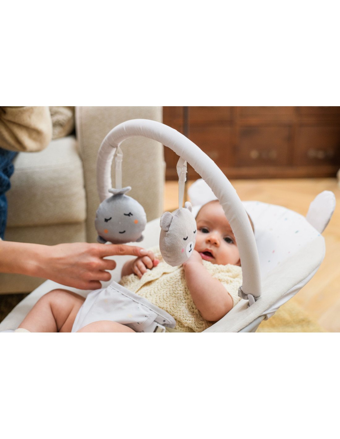 Senzorické hračky Lehátko MoMi GLOSSY má odnímatelnou hrazdičku, na které jsou zavěšeny 2 senzorické hračky – chrastítko a pískátko. Hrazda lze jednoduše nasadit a sundat bez použití nářadí. |